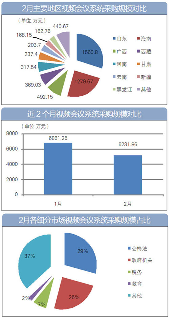 2月,全國共完成公檢法系統視頻會議系統采購項目8個,采購總規模約1530.86萬元,占總采購規模的29%。
