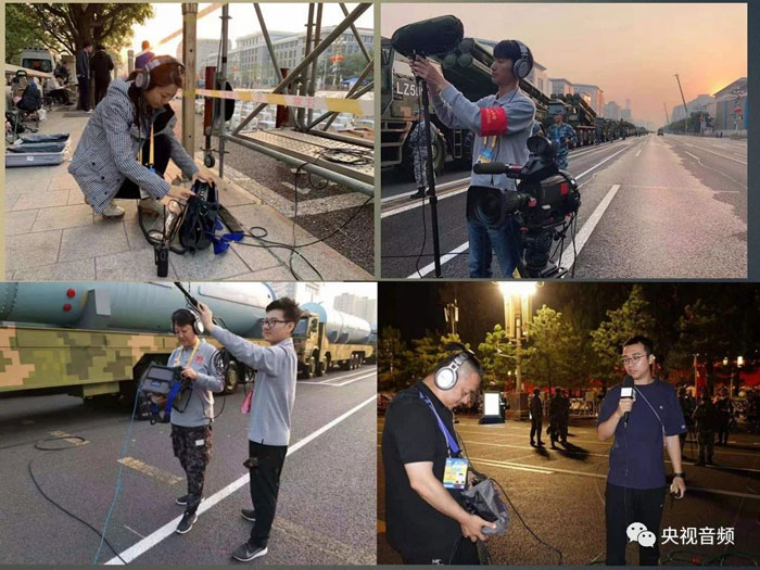 閱兵沿線的聲音構成來自于三方面,一是移動拍攝車上首次使用環繞聲話筒拾取的受閱方陣周圍的環境氣氛,用來在閱兵沿線構建環繞聲場,使直播環繞聲氣氛達到完整一致。二是擴聲保障組送來的每個方陣的領隊和方陣應答的擴聲信號。三是機頭和挑桿話筒近距離拾取的應答聲效。如此三方面聲音元素組合起來,制作成為完整的,有點有面,有整體有細節的,激情澎湃的方陣應答聲音。