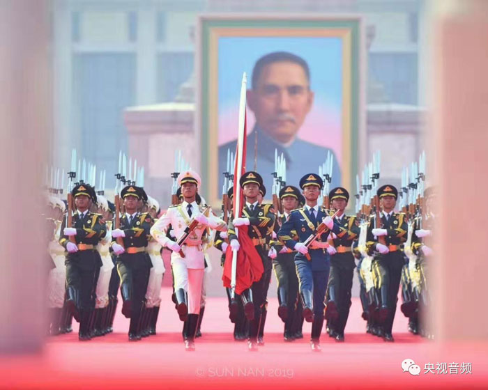 在全場10萬人屏息凝神的時候,標兵踏出堅實的腳步