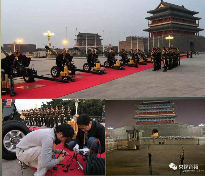 總臺聲音團隊先后5次抵達炮兵訓練基地,實地進行勘察、測試,與基地的技術人員進行深入溝通了解。對十余種型號的話筒逐個進行實地測試,同時將聲音錄制在多軌錄音機上,在錄音棚中進行聲音比對,最終根據話筒特點和廣場的現場環境確定了選型和擺放位置,從而達到滿意的效果。