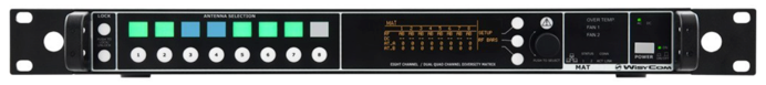 能夠實現這么多通道的無線話筒隨意分配使用,要歸功于WisyCom的天線矩陣MAT244。天線矩陣MAT244是整個系統的核心,互通互聯的房間通過天線矩陣系統統一管理,將所有天線分配器的信號分配到每個房間內的無線接收機內,實現話筒隨意切換使用。