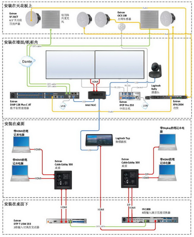 Extron DMP 128 PLUS DSP 處理器和 XPA 2004 放大器提供音頻處理和放大。