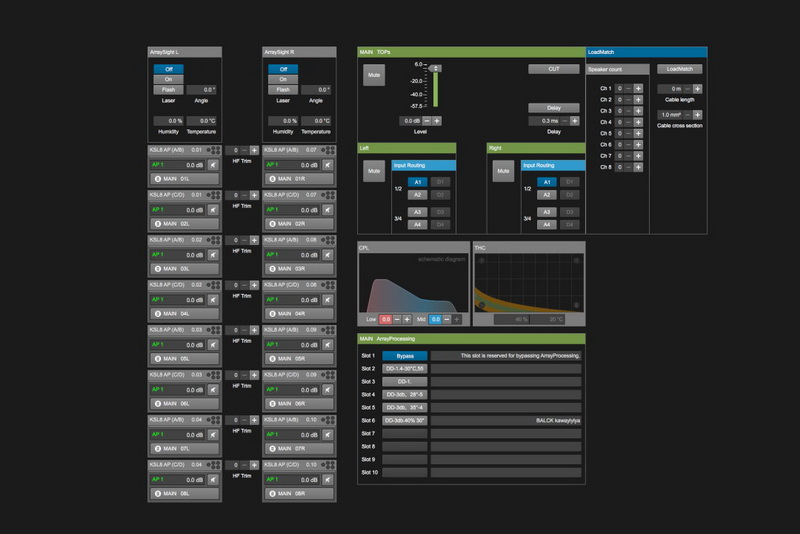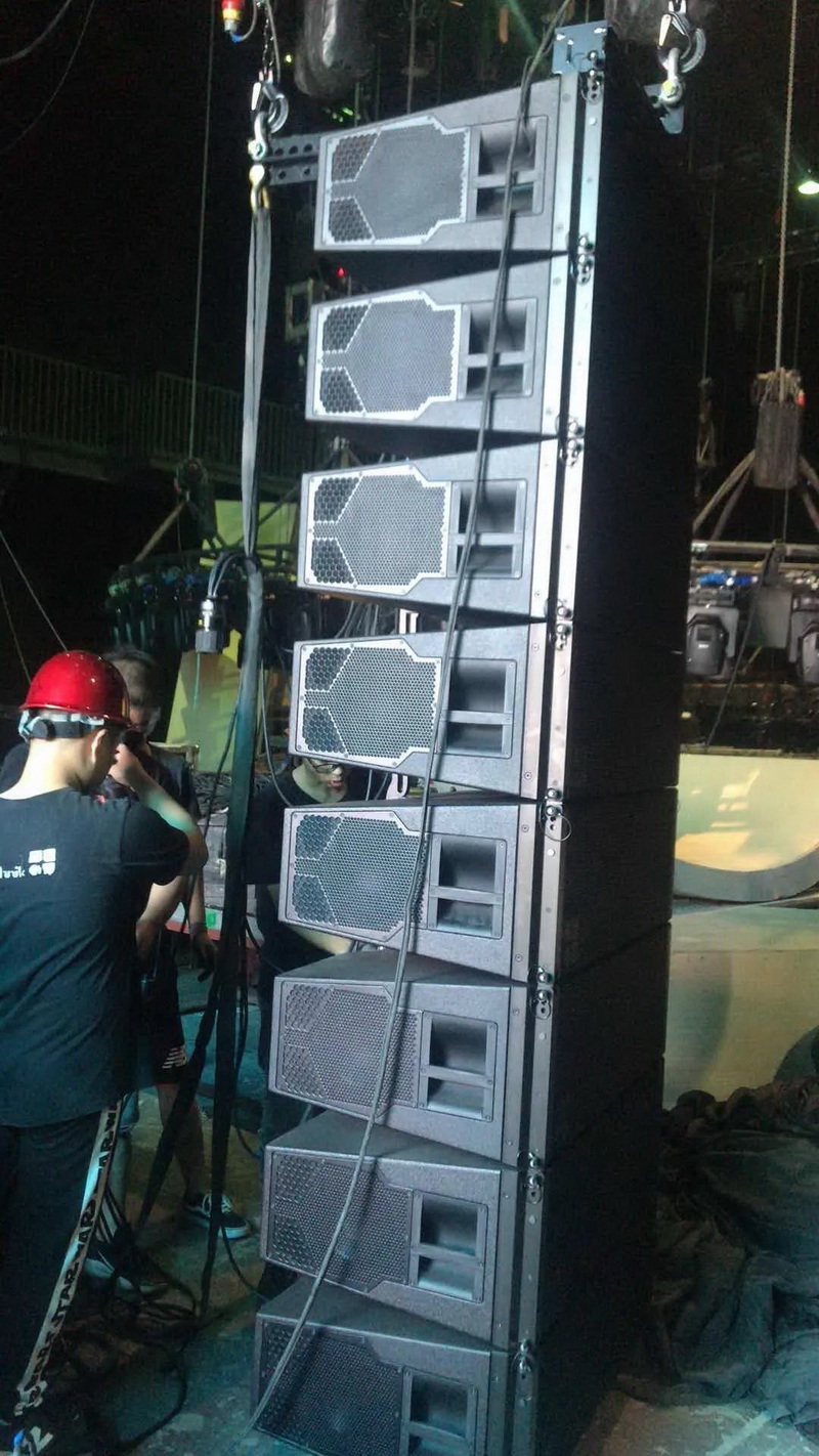 主擴系統(tǒng)采用了16只KSL8線陣列全頻音箱,這是專門為中大型擴聲需要而設(shè)計的。KSL8具有 80° 水平覆蓋,在類似尺寸的線陣列模塊中獨具特色,可在最低頻率下提供一致的指向性控制。兩個前向10"驅(qū)動單元和兩個側(cè)向8"驅(qū)動單元的幾何形狀相互配合并使用心型技術(shù),創(chuàng)建精確的頻率帶寬指向性控制,并顯著擴展朝向觀眾的低頻動態(tài)余量。中頻由一個裝有8"驅(qū)動單元的高靈敏度號角提供,而安裝在波導(dǎo)裝置上的兩個創(chuàng)新定制型3"音圈高頻驅(qū)動單元可提供高頻分辨率和輸出。