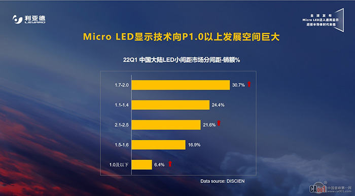 根據(jù)行業(yè)數(shù)據(jù)分析,傳統(tǒng)LED小間距市場中,受制于Micro LED顯示技術(shù)難度、價(jià)格、供應(yīng)鏈等因素的影響,P1.0以下產(chǎn)品市場占有率不到7%,P1.0-P2.0點(diǎn)間距的產(chǎn)品市占率接近80%,市場空間巨大。